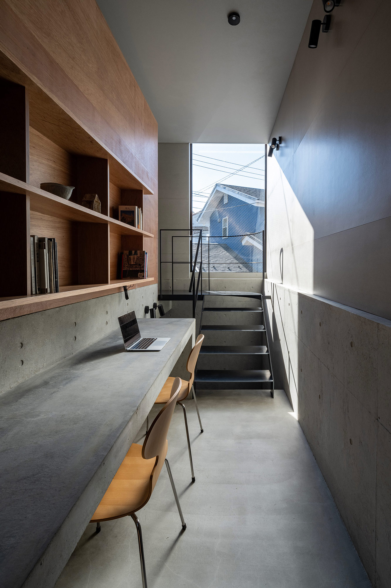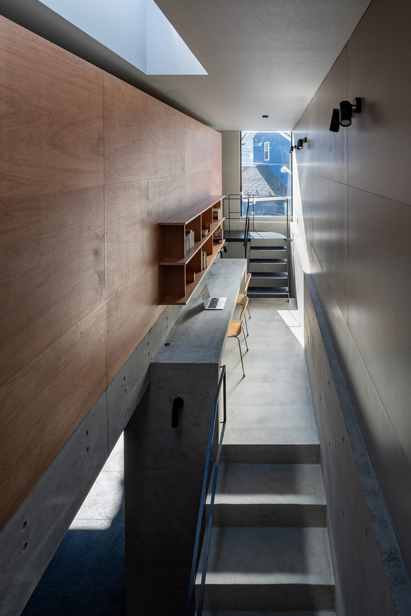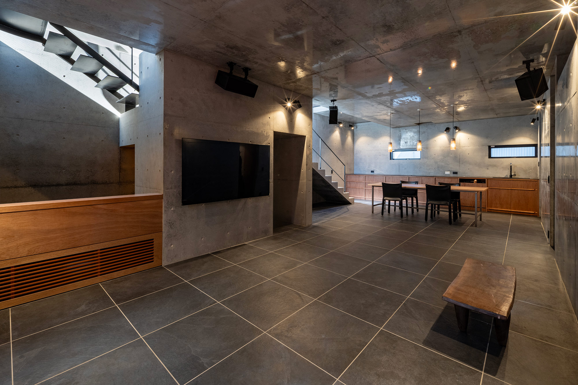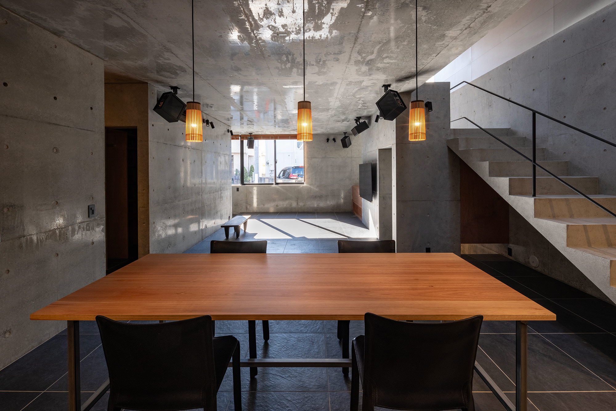 DJを趣味とする、音楽が大好きな夫婦のための住宅です。三方囲まれた奥行き11メートルのアプローチを持つ旗竿敷地ですが、伸びやかでゆったりとした空間をつくることを目指しました。主室であるリビングダイニングのある1階は、近隣への音響対策とできる限り広々としたワンルームを確保するため、壁式鉄筋コンクリート造を採用。打ち放し仕上げにしています。そして1階、緩い階段、中2階を吹き抜けがつなぎ、立体的なワンルーム空間を構成しています。またこの住宅は断熱性や気密性などに配慮し、再生可能エネルギーも創出するなど、ZHE(ネット・ゼロ・エネルギー・ハウス)基準を満たしています。