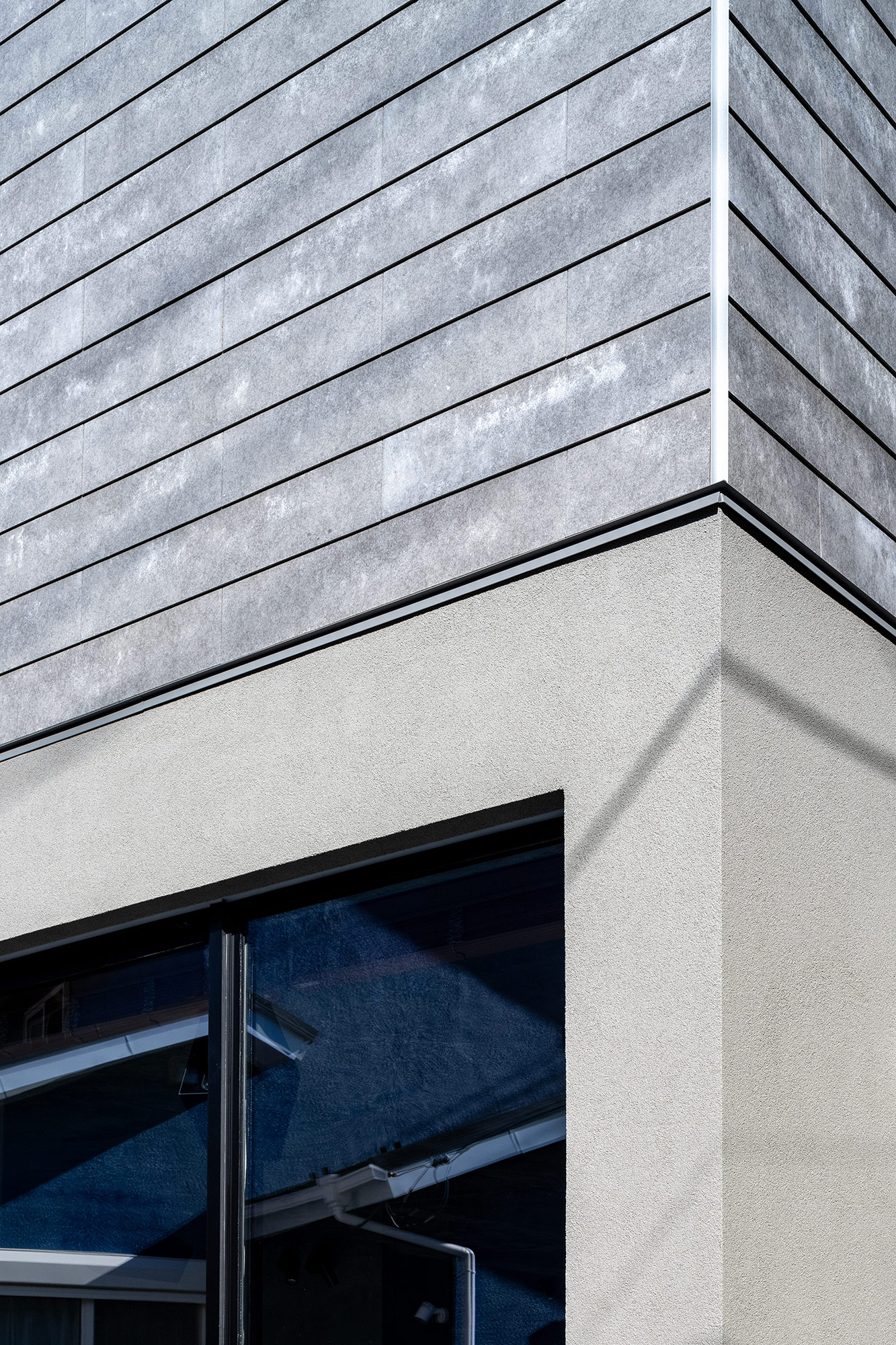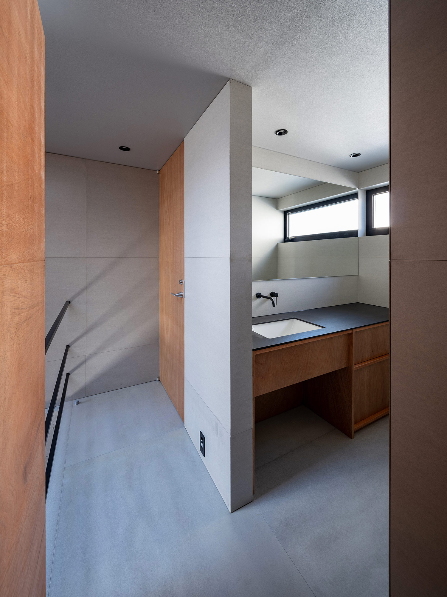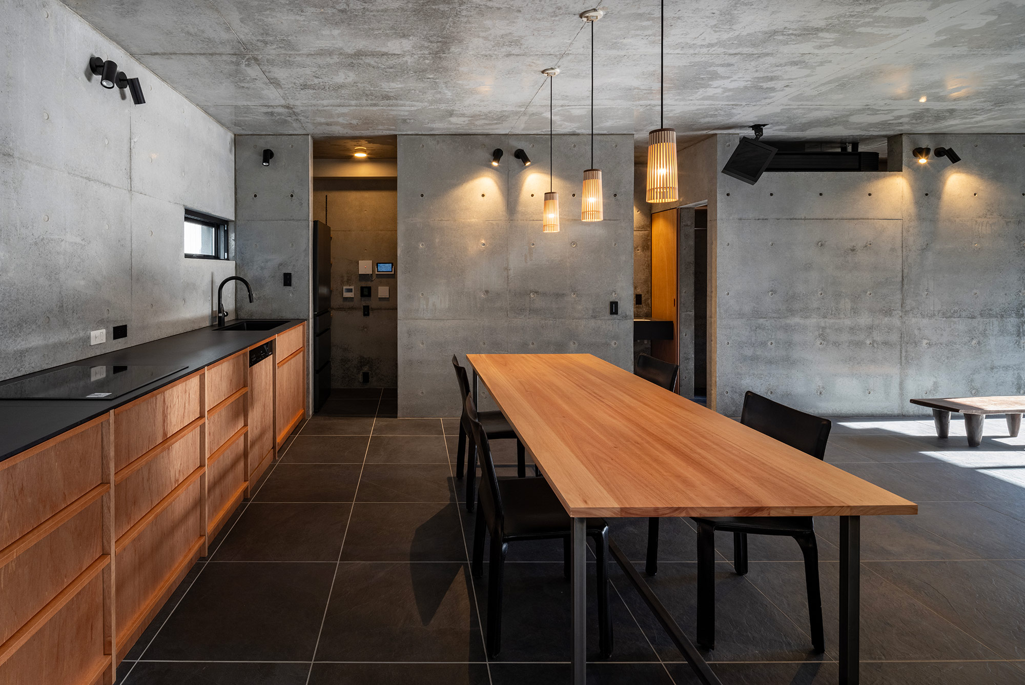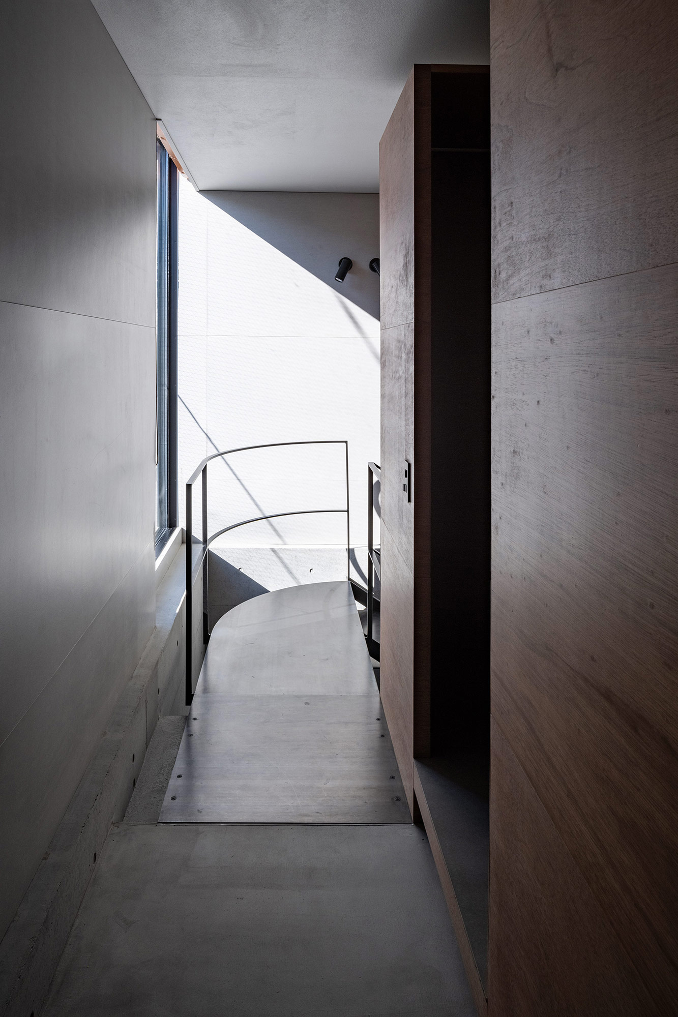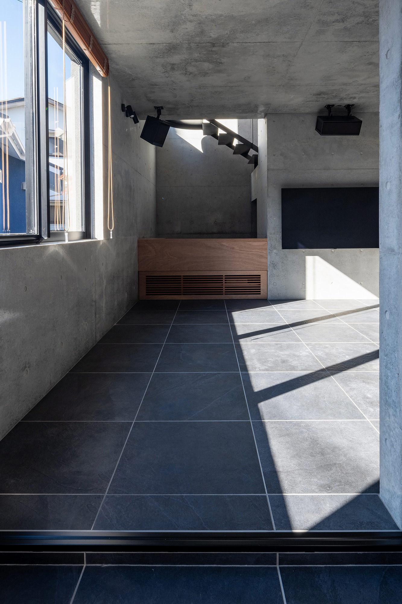 DJを趣味とする、音楽が大好きな夫婦のための住宅です。三方囲まれた奥行き11メートルのアプローチを持つ旗竿敷地ですが、伸びやかでゆったりとした空間をつくることを目指しました。主室であるリビングダイニングのある1階は、近隣への音響対策とできる限り広々としたワンルームを確保するため、壁式鉄筋コンクリート造を採用。打ち放し仕上げにしています。そして1階、緩い階段、中2階を吹き抜けがつなぎ、立体的なワンルーム空間を構成しています。またこの住宅は断熱性や気密性などに配慮し、再生可能エネルギーも創出するなど、ZHE(ネット・ゼロ・エネルギー・ハウス)基準を満たしています。
