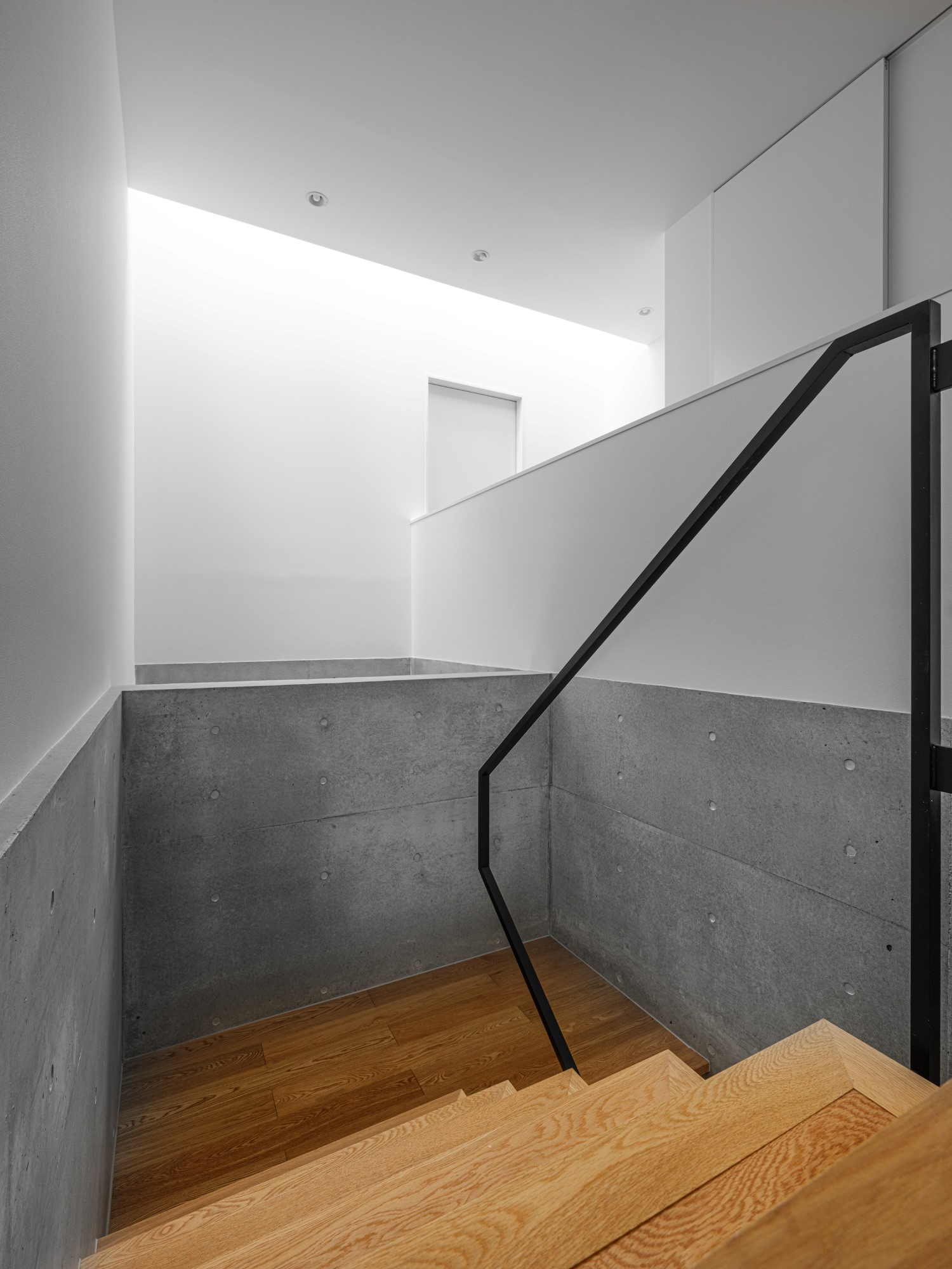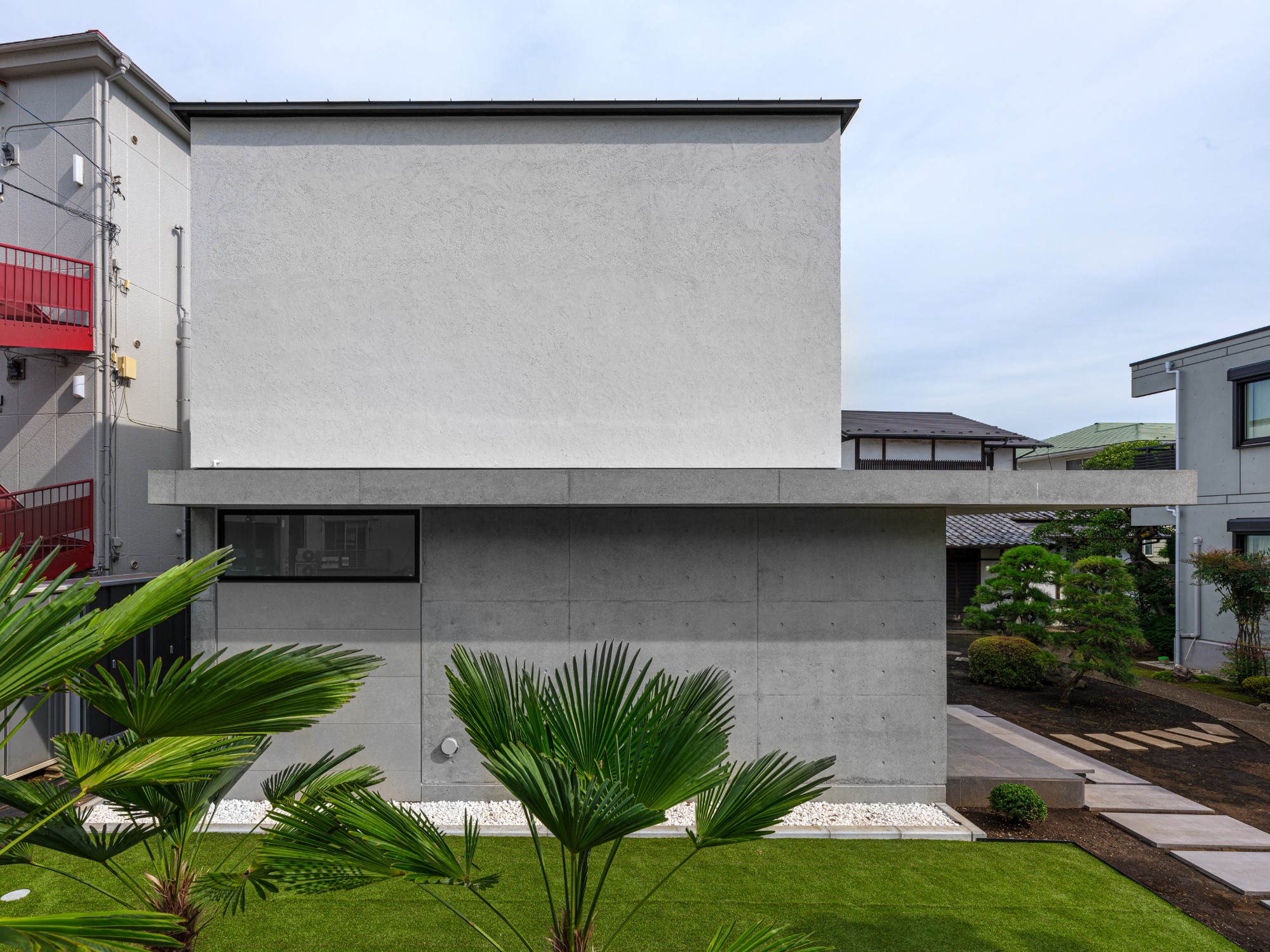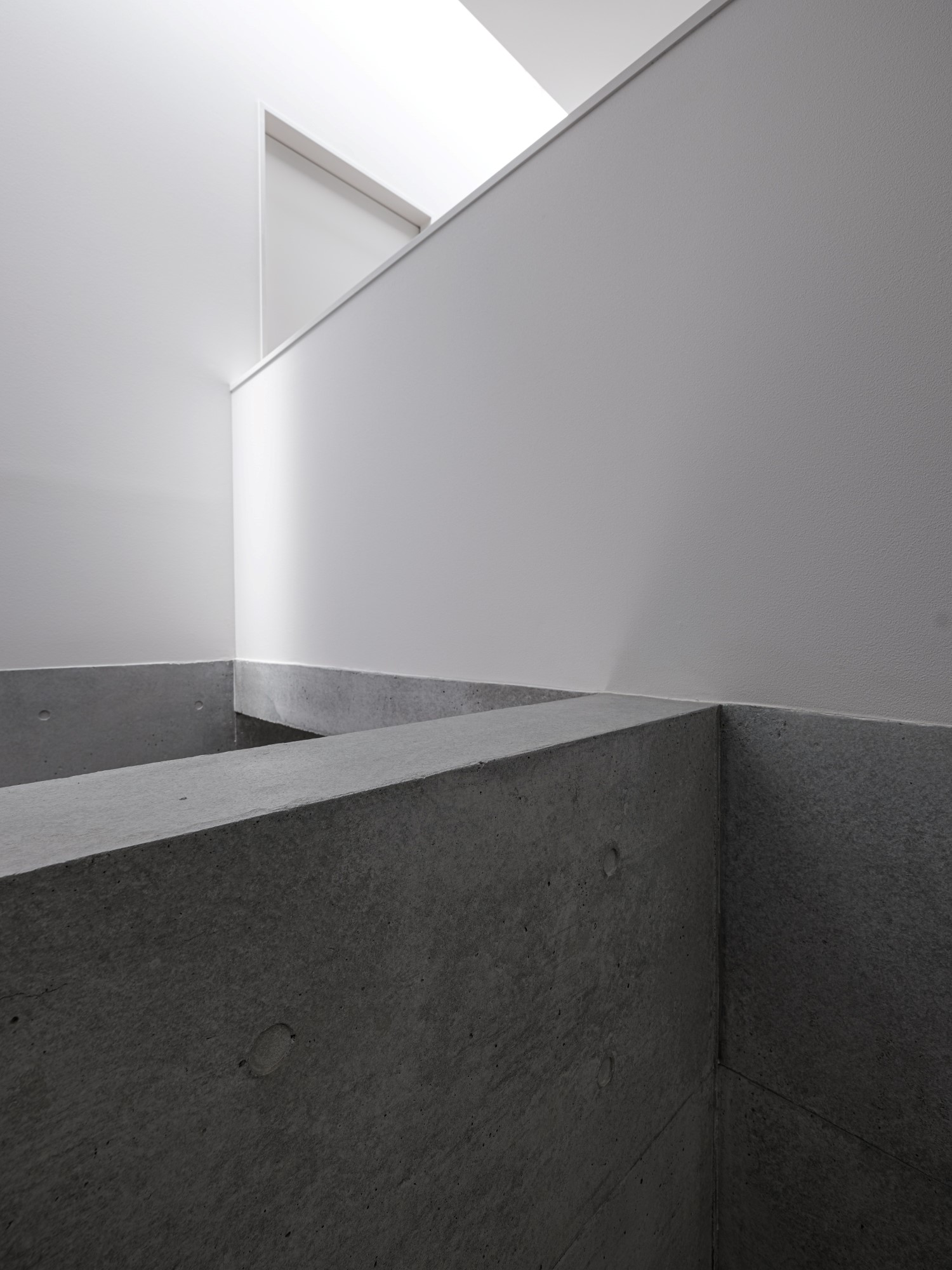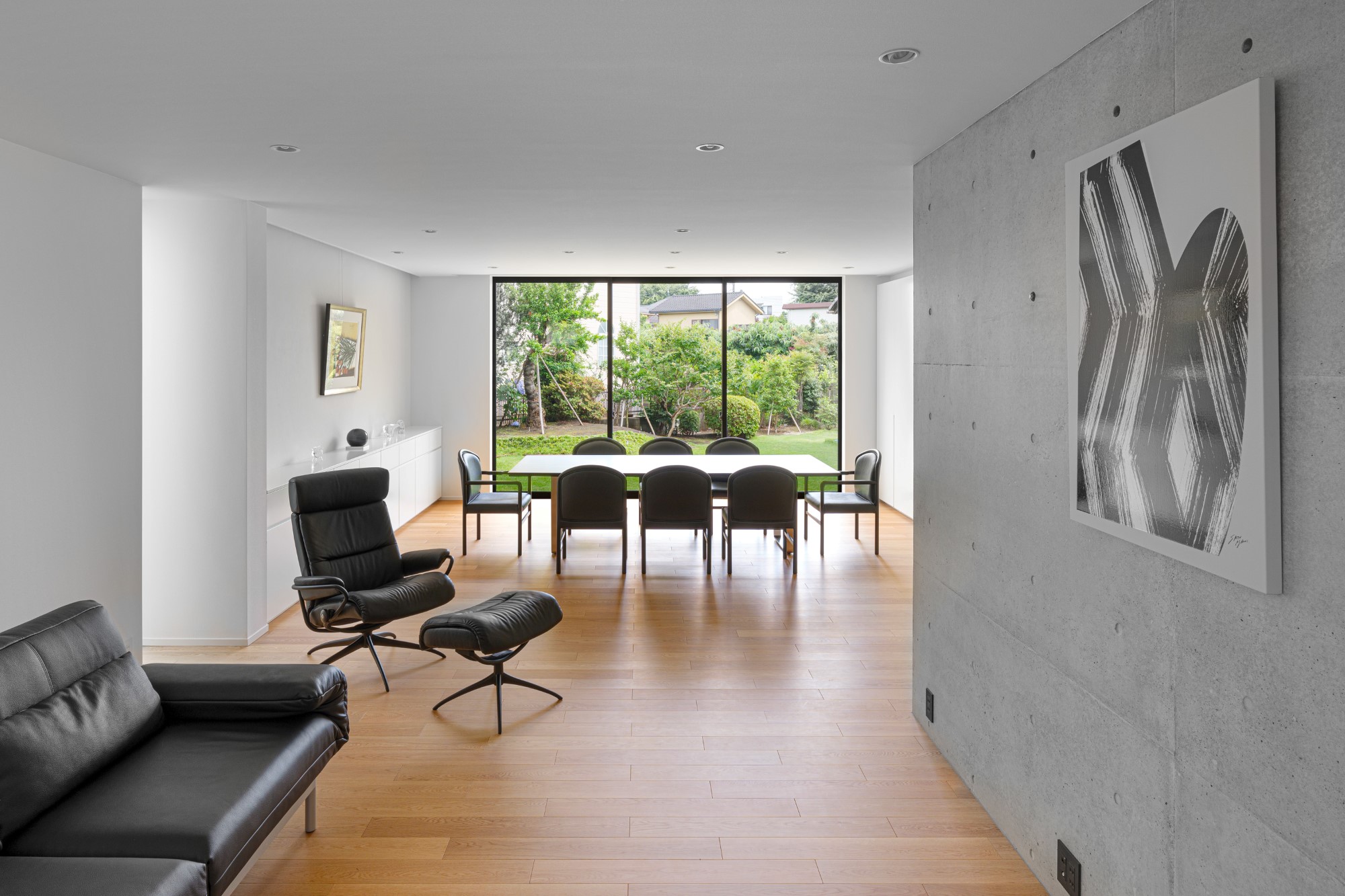 プライバシーを確保しながらも明るく開放的な空間をつくりたいという建て主の要望を実践した住宅です。都心部でありながら南側にある母屋の広い庭を共有する敷地で、庭と建物の関係性も熟考しながらプランニングしました。1階の南側に大きく開口部を設けることで、庭の風景と自然光を最大限に取り込んでいます。幹線道路に面した北側の玄関は吹き抜けにして大きな天窓を設けることで、プライバシーは確保しつつ1階まで自然光が降り注ぐ、明るい空間が生まれました。室内は打放し仕上げの構造壁をそのまま生かし白色を混ぜた保護塗料を使用、コンクリートの質感をのこしながら明るく仕上げています。