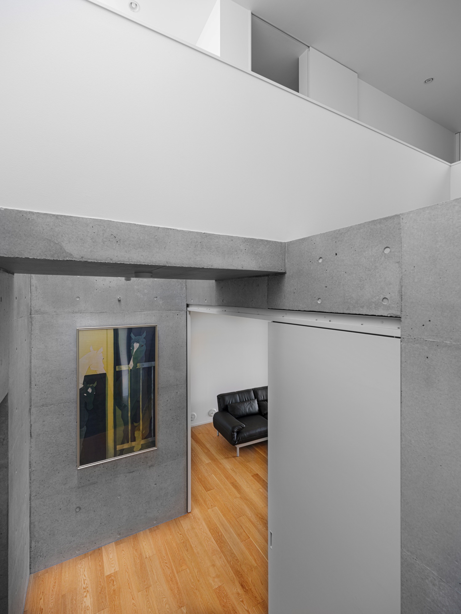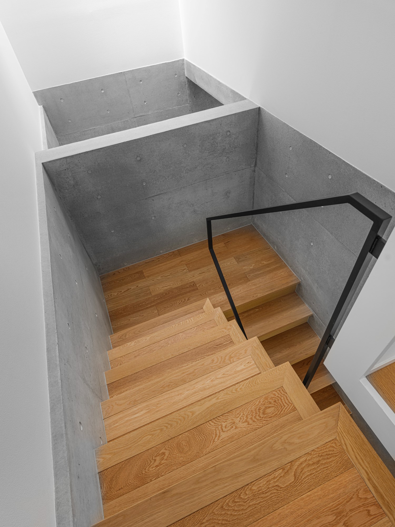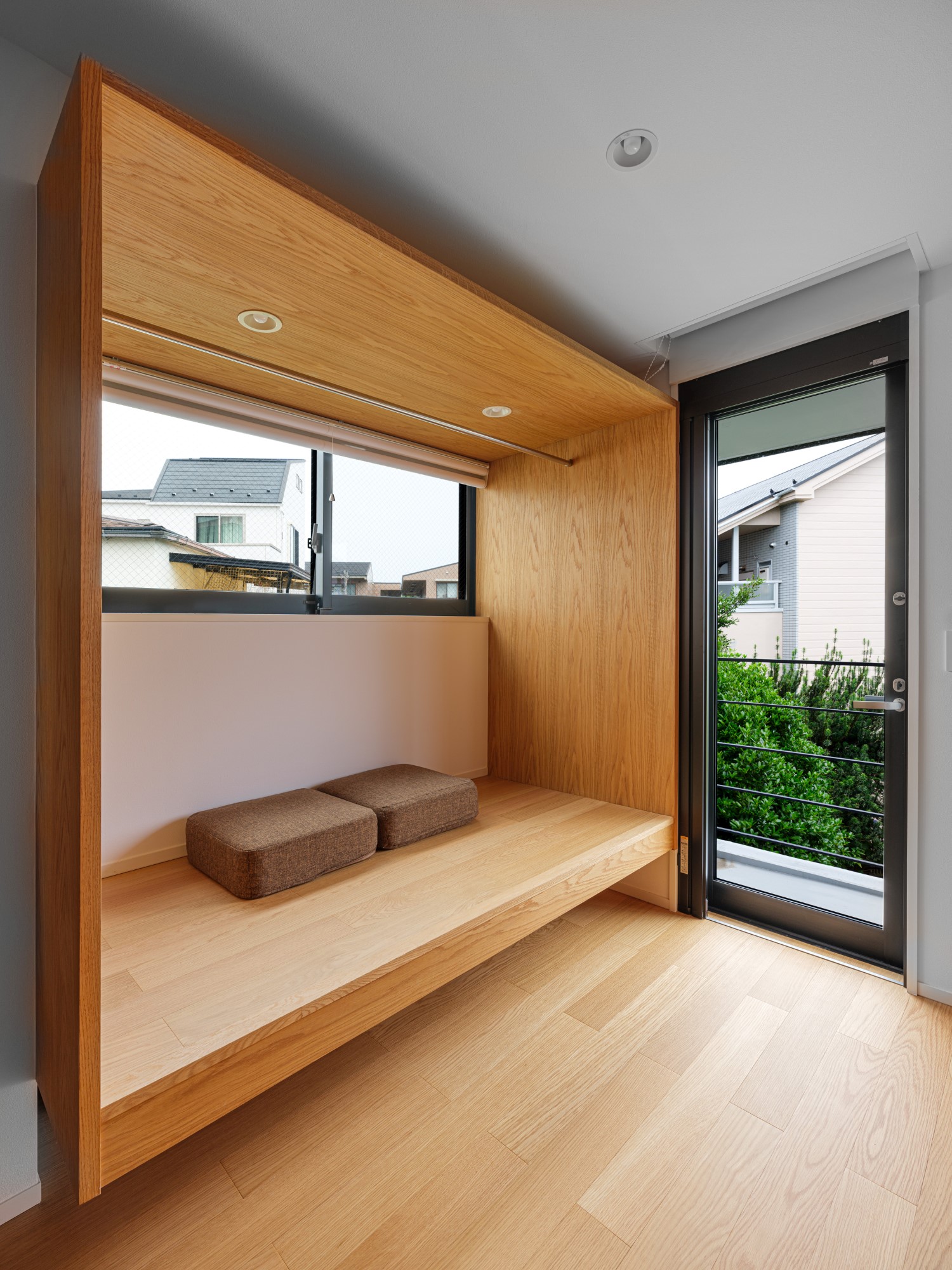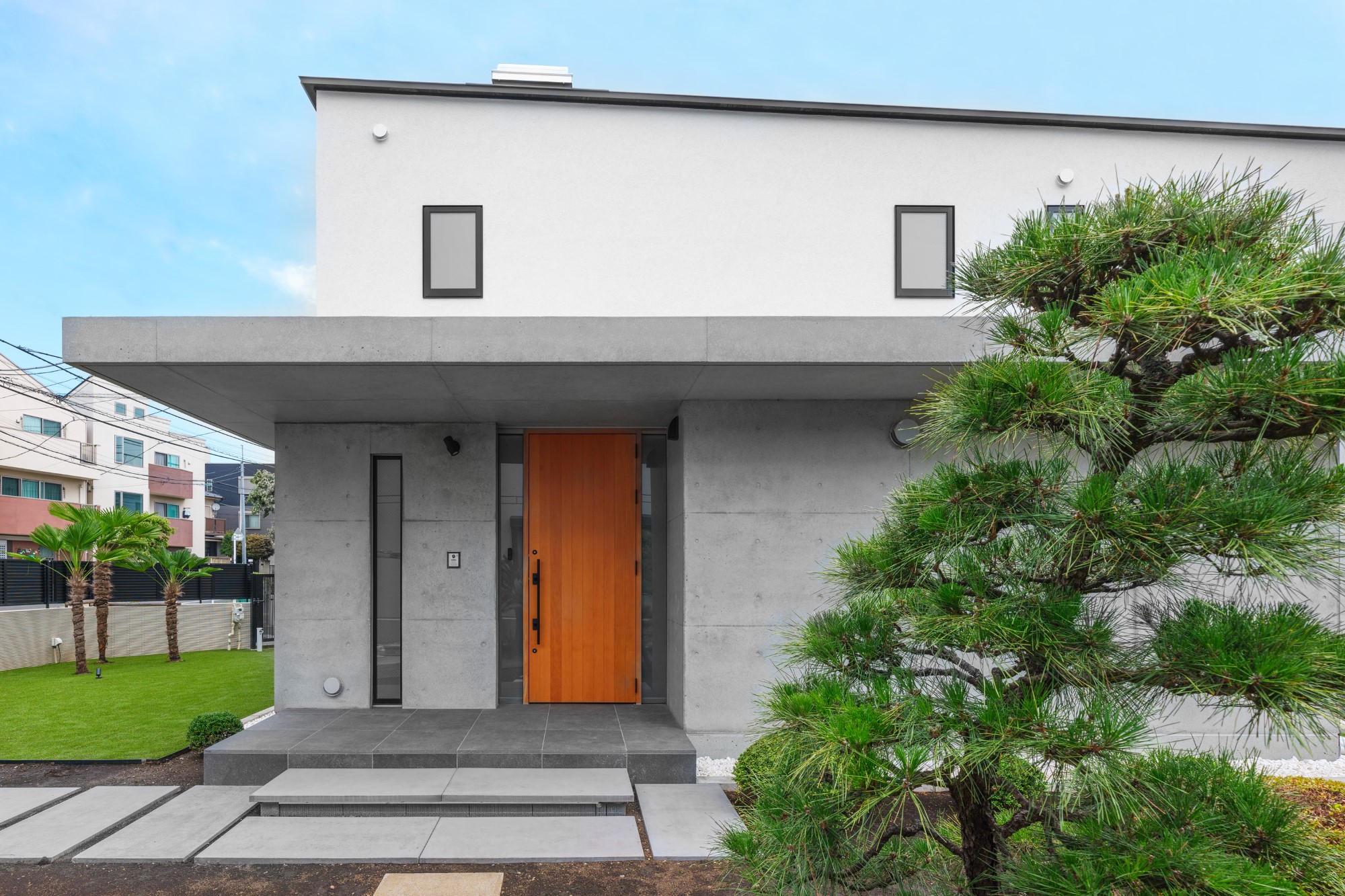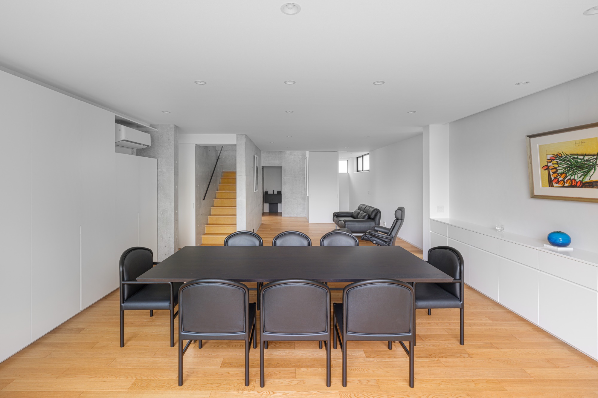 プライバシーを確保しながらも明るく開放的な空間をつくりたいという建て主の要望を実践した住宅です。都心部でありながら南側にある母屋の広い庭を共有する敷地で、庭と建物の関係性も熟考しながらプランニングしました。1階の南側に大きく開口部を設けることで、庭の風景と自然光を最大限に取り込んでいます。幹線道路に面した北側の玄関は吹き抜けにして大きな天窓を設けることで、プライバシーは確保しつつ1階まで自然光が降り注ぐ、明るい空間が生まれました。室内は打放し仕上げの構造壁をそのまま生かし白色を混ぜた保護塗料を使用、コンクリートの質感をのこしながら明るく仕上げています。