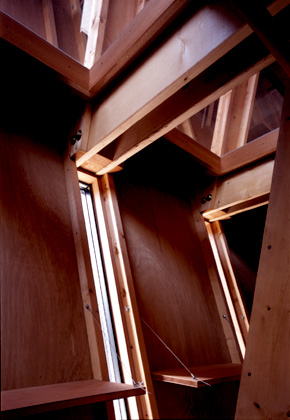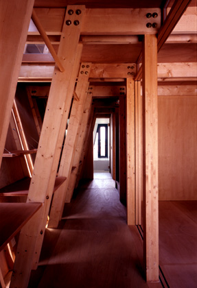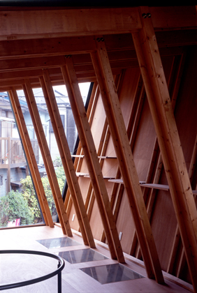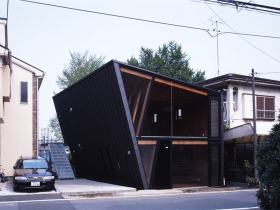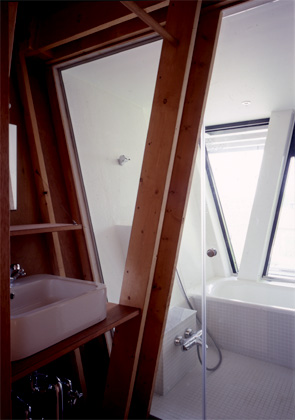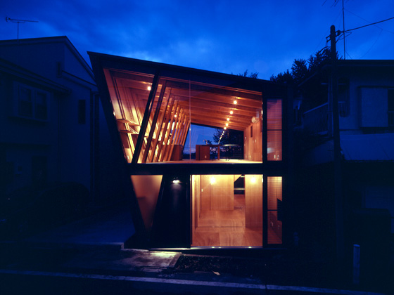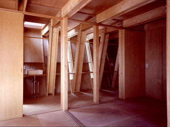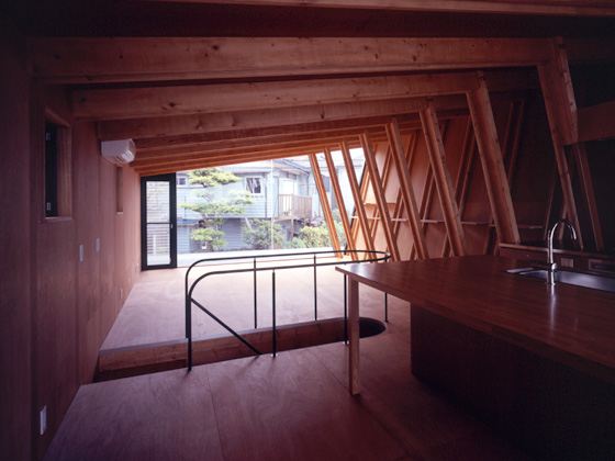 起伏に富んだ傾斜地の住宅街に建つ、木造の一軒家です。大きく斜めに倒れた壁は、構造としての役割としてだけでなく、収納棚や水回りがおさまっています。また、視界の抜けと空間のリズムもつくり出しています。近隣と面している左右は閉じて、東西は思いきり開くことで、近隣の緑を取り込んでいます。門型フレームに囲まれた筒状の空間には開口部から自然光が差し見込み、インテリアに広がりをもたらしています。