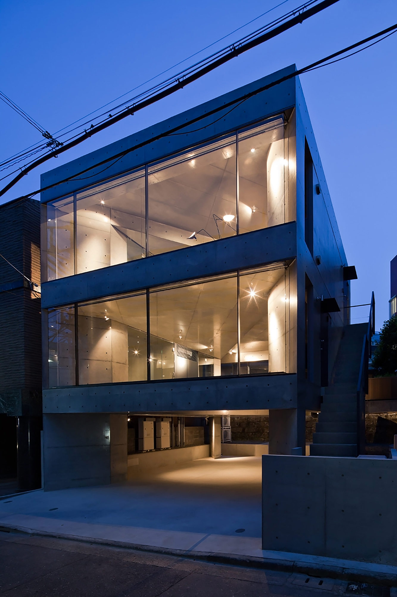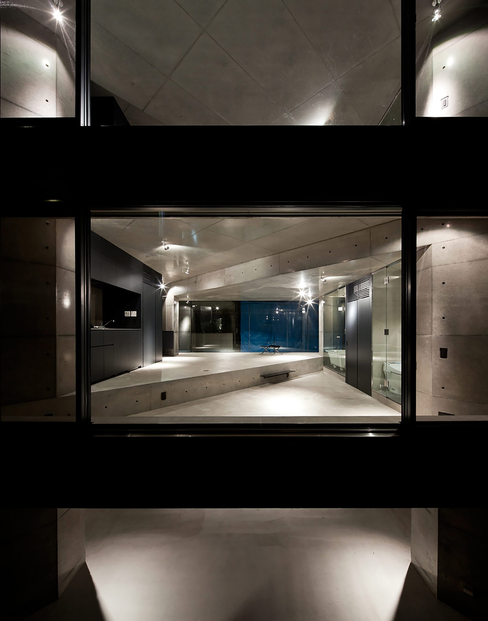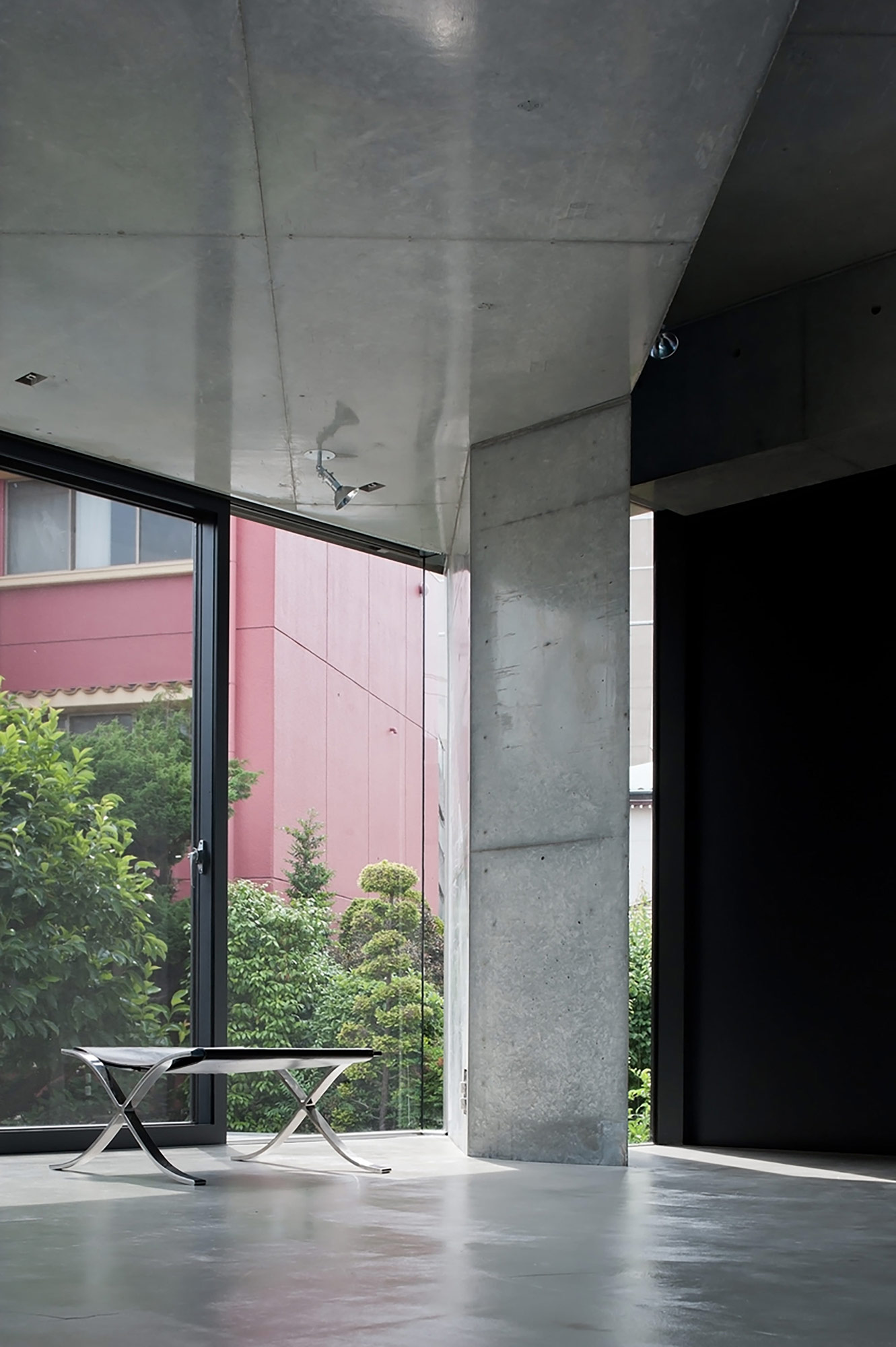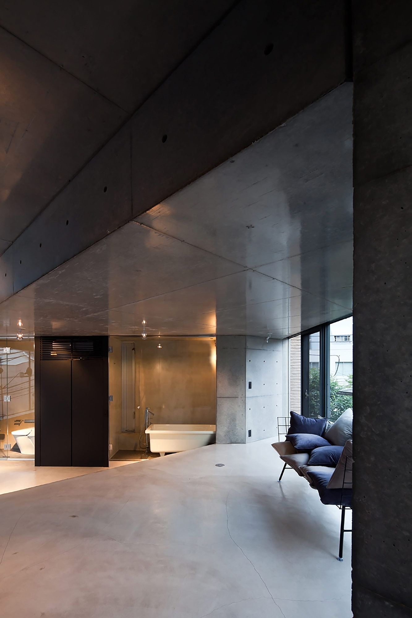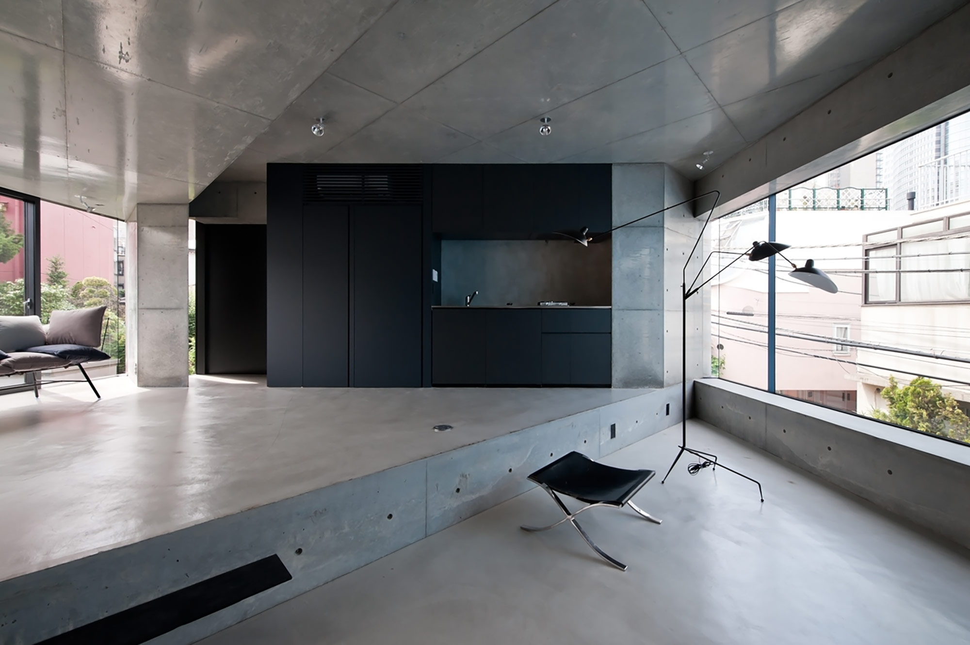 東京・港区元麻布に建つ、2階と3階に一戸ずつ、たった2戸の小さな集合住宅です。一戸の面積は約60㎡。壁をつくらずその面積をめいっぱい活用することが、このプロジェクトの肝と考えました。そこで床と天井にゆるやかな段差を設け、空間はひとつながりでありながら四つの領域に分けられるようにしました。これは四隅に立ち上げた柱と、その対角線上に設けた各階スラブの段差によって生まれたもの。パースの聞いた独特のスケール感をつくり出せて、ワンルームという空間の新たな可能性を見いだせたと感じています。