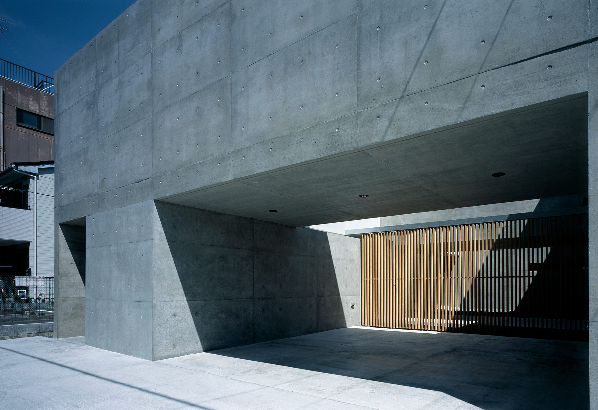 アパートへのアプローチとなる北面と、築60年の老朽化した住宅が近接する東南2面については、建物を耐火壁で囲い込み交通量の少ない西面のみ、ルーバーを通して敷地内外の気配が感じられるようにした。