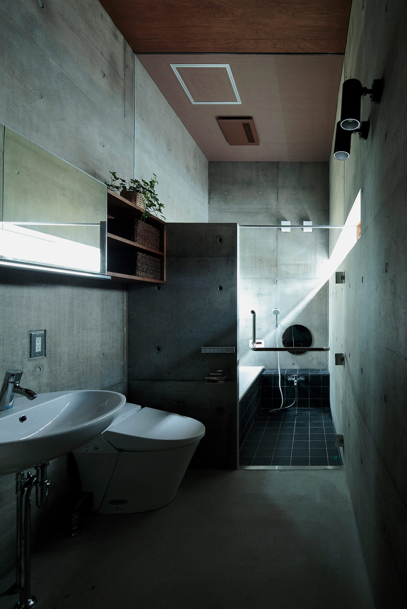 また、ざっくりとした質感の普通合板型枠の打放しは、昭和の面影を残したこの街並みにうまく溶け込んでいる。