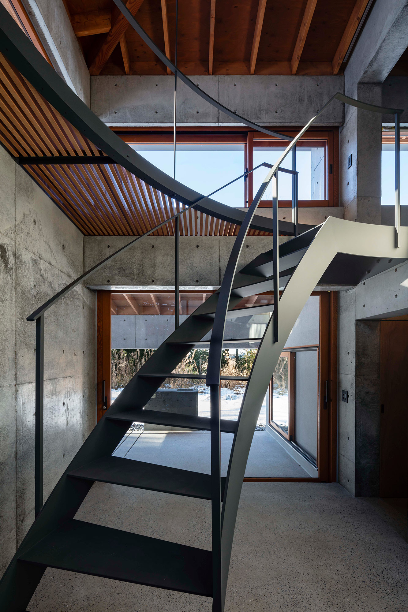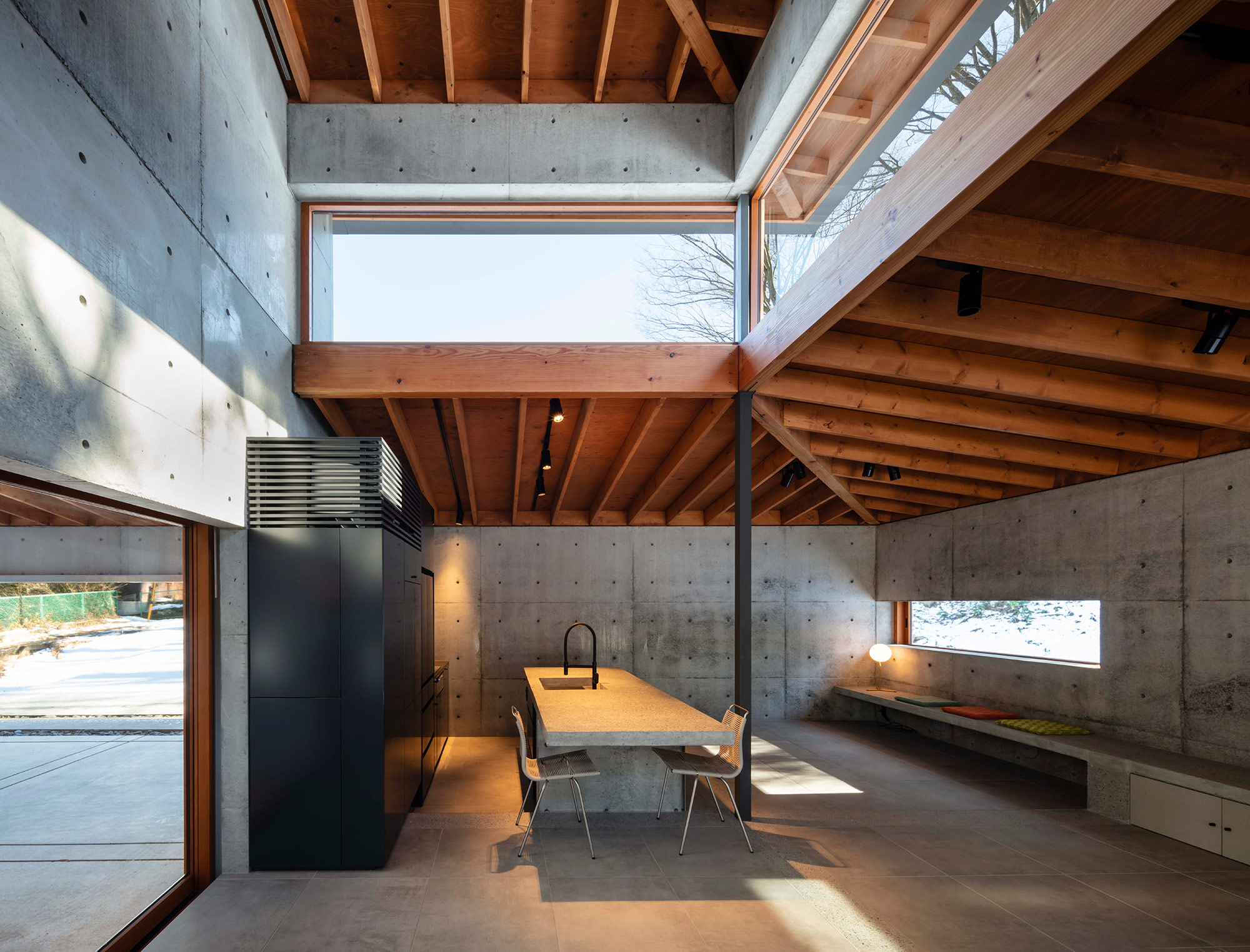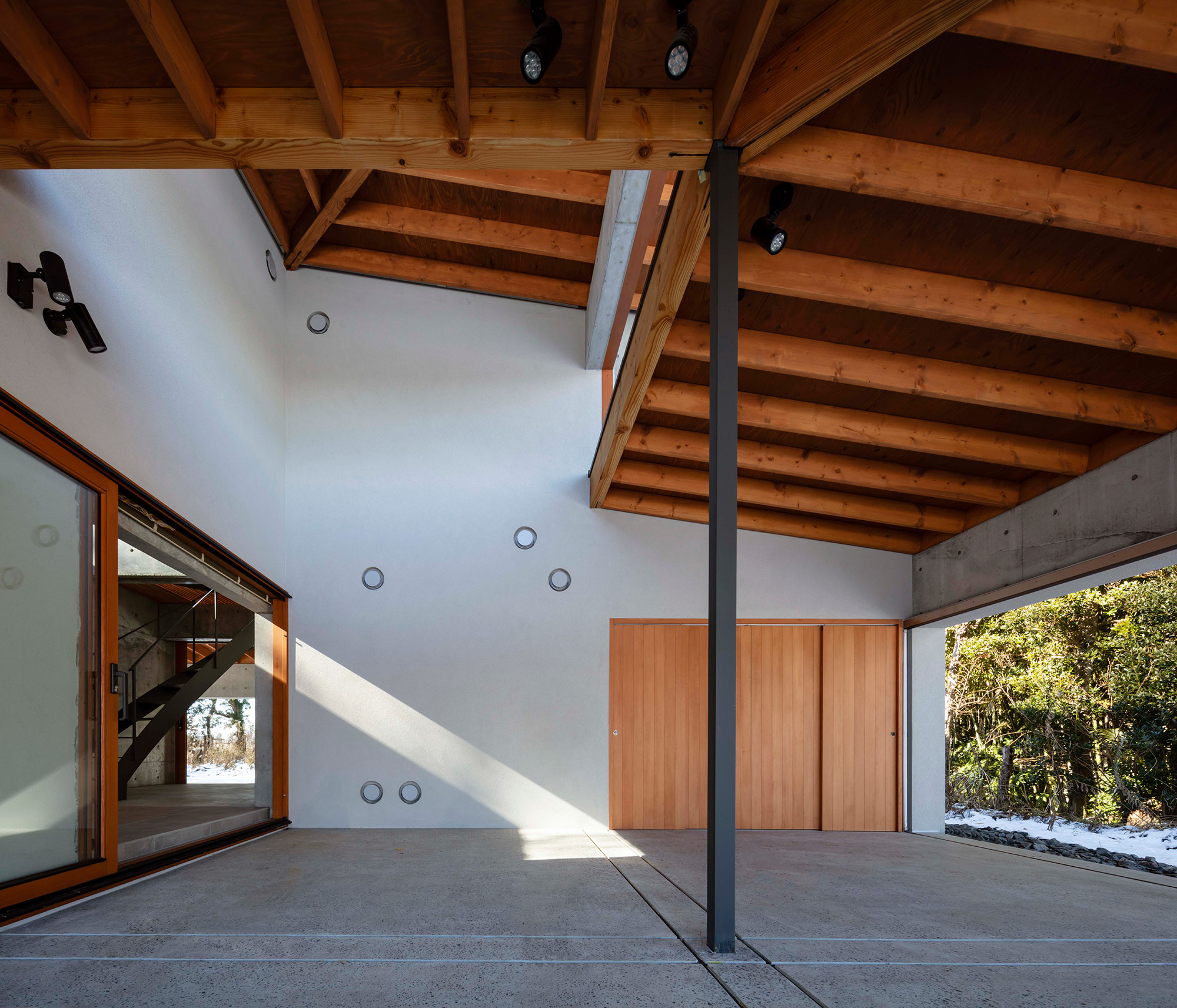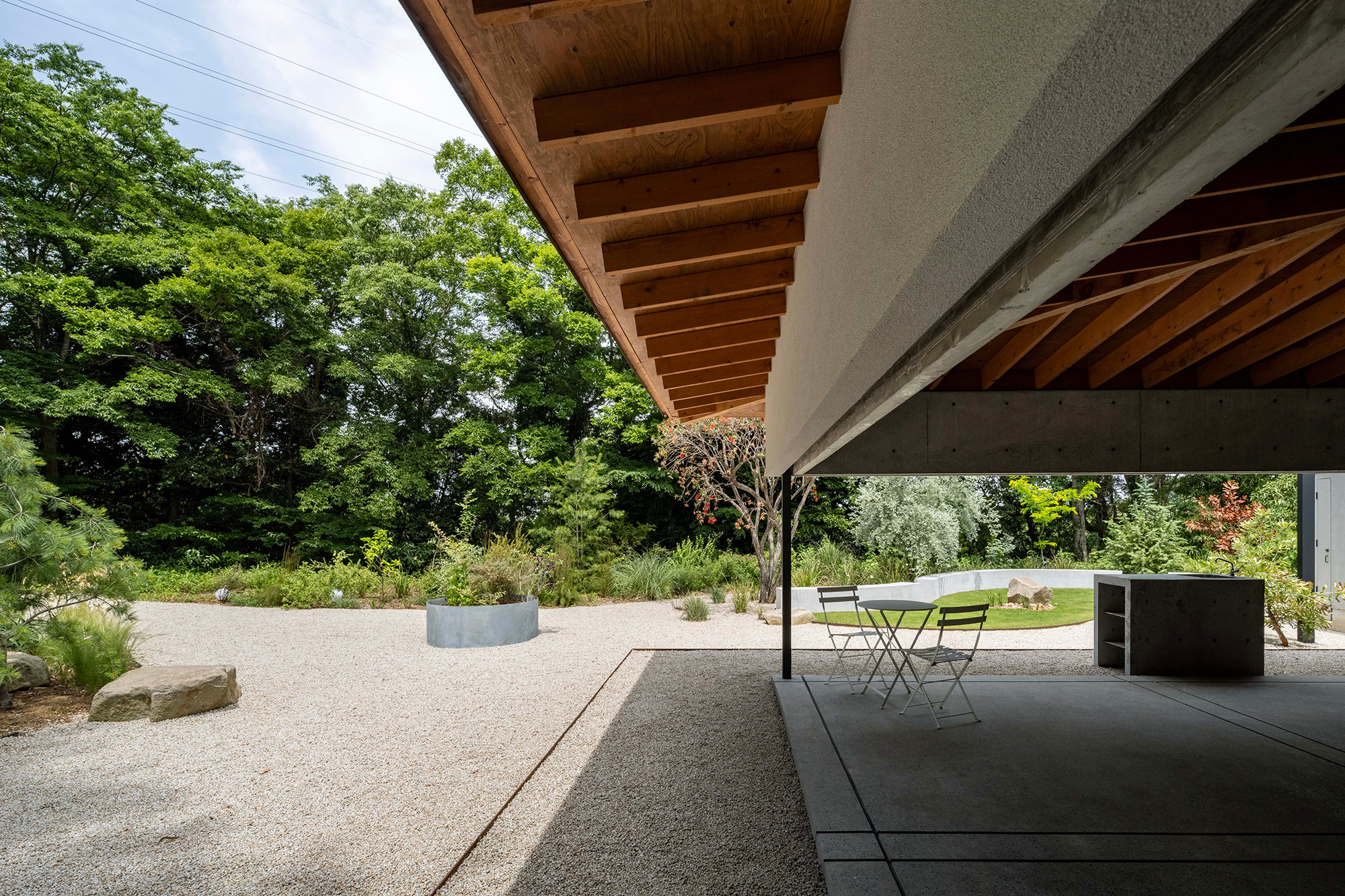 緑に囲まれた環境で、日常生活でもアウトドアを楽しみたいという建て主の希望をかたちにした住宅です。低い軒と緩やかな屋根が、外部からの視線は遮りながらも室内と庭をつなげています。また、テラスとアトリエという半外部空間が仲介することで、住まいと豊かな自然が一体化することに一役買っています。周辺の高木が日光を遮ってしまうのですが、上階のハイサイドライトや吹き抜けを設けることで光を室内に取り込むと同時に、そこからも木々や青空が眺められ、どこにいても自然を感じられる空間になっています。